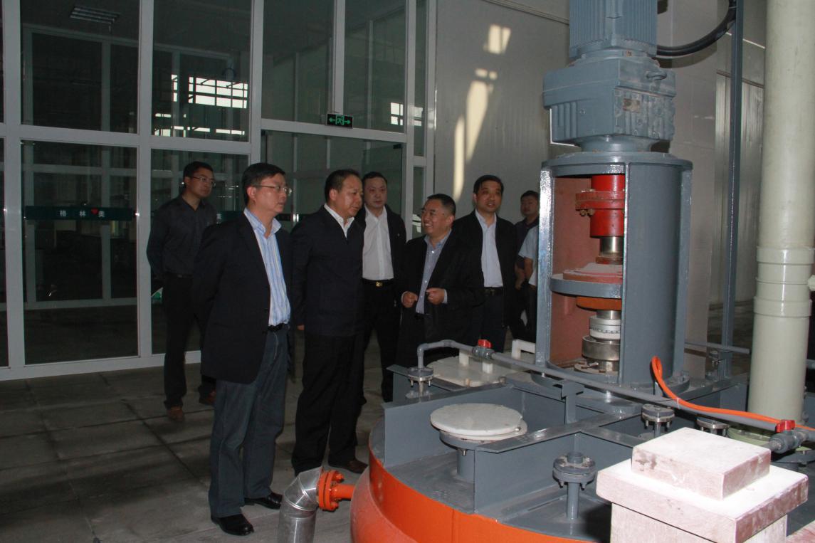 圖二 許開(kāi)華董事長(zhǎng)(右二)向萬(wàn)勇書(shū)記(左三)介紹三元?jiǎng)恿﹄姵夭牧锨膀?qū)體生產(chǎn)線(xiàn)設(shè)備