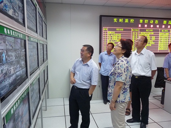 圖二 向欣司長(前右一)、陳華志副廳長(后右一)、許開華董事長(左一)參觀格林美實(shí)時(shí)監(jiān)控系統(tǒng)