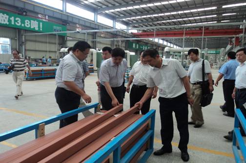肖安民副主任(前中)一行對(duì)格林美的循環(huán)再造產(chǎn)品塑木型材