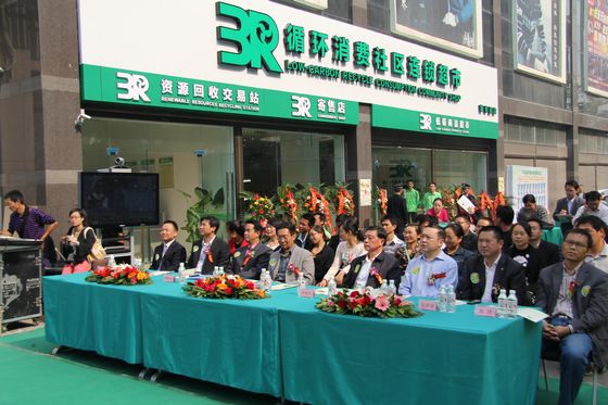 2011年10月18日上午,全國(guó)首家以循環(huán)消費(fèi)為主題的“3R循環(huán)消費(fèi)社區(qū)連鎖超市”(3R店)在湖北省武漢市和荊門市兩地三店隆重開業(yè)。自此,國(guó)內(nèi)第一家集合低碳商品銷售、二手商品寄賣及再生資源交易與循環(huán)利用于一體的新型循環(huán)消費(fèi)超市正式在湖北閃亮登場(chǎng),標(biāo)志著一個(gè)改變居民生活方式的循環(huán)消費(fèi)商業(yè)模式的誕生!湖北省政府郭生練副省長(zhǎng)、武漢市人大常委會(huì)副主任鄭永新、荊門市委常委、副市長(zhǎng)胡道銀、荊門市人大常委會(huì)副主任賀明海、荊門市政協(xié)副主席文觀云,湖北省商務(wù)廳、荊門市政府、省、市有關(guān)部門領(lǐng)導(dǎo)以及中央、省市媒體代表和社區(qū)居民、學(xué)生代表共300余人分別在武漢、荊門兩地出席了此次開業(yè)慶典。