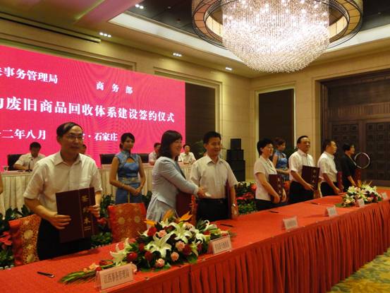 ?????? ?2012年8月16日,國家商務部、國管局在石家莊組織8家試點省市的回收企業(yè)和機關(guān)服務管理部門簽約,合作建設(shè)公共機構(gòu)廢舊商品回收體系,國管局公共機構(gòu)節(jié)能管理司司長何長江和商務部流通發(fā)展司副司長王旭斌參加了此次簽約儀式。武漢格林美資源循環(huán)有限公司總經(jīng)理王健代表公司參加了簽約儀式,并代表回收企業(yè)發(fā)言。