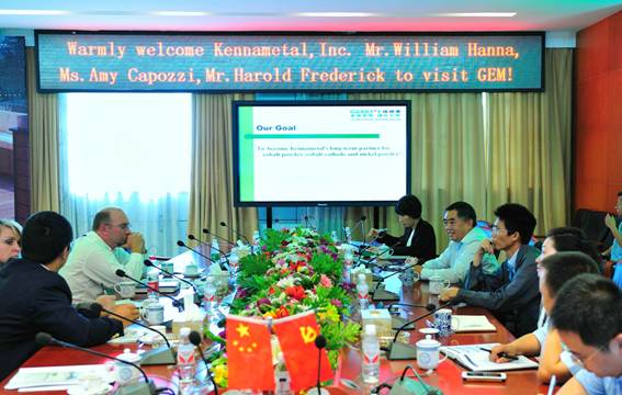 ????? 2012年9月12日,美國肯納金屬公司Mr. William Hanna, Ms. Amy Capozzi,Mr. Harold Frederick蒞臨荊門格林美城市礦產(chǎn)資源循環(huán)產(chǎn)業(yè)園進(jìn)行考察調(diào)研,格林美董事長許開華、常務(wù)副總王敏陪同客人考察了荊門格林美分析檢測中心、電子廢棄物車間、鈷粉生產(chǎn)車間、特種鈷粉制造車間、研發(fā)中心、稀貴金屬車間以及德威格林美。參觀完畢后雙方進(jìn)行了座談交流。